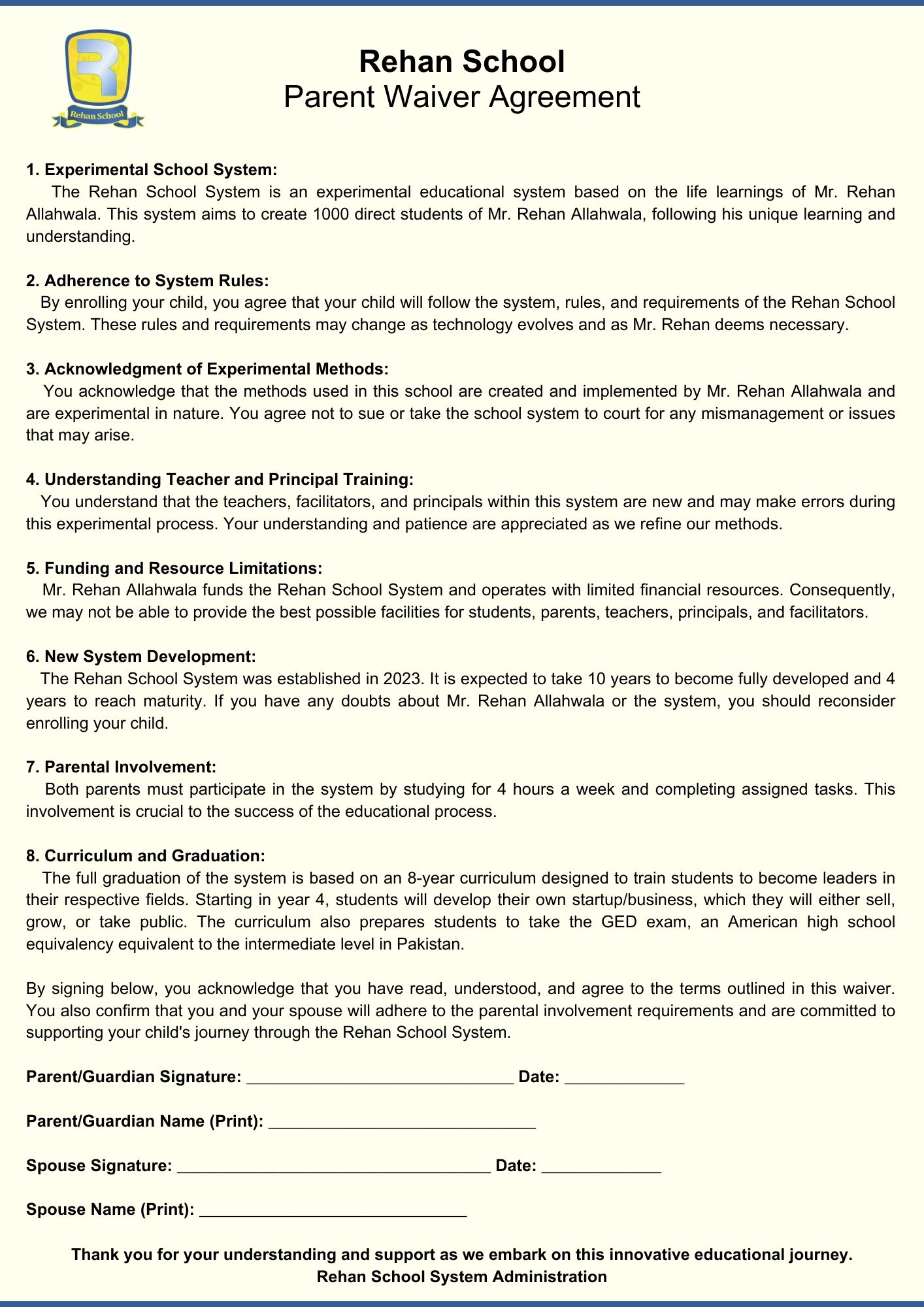 By signing below, you acknowledge that you have read, understood, and agree to the terms outlined in this waiver. You also confirm that you and your spouse will adhere to the parental involvement requirements and are committed to supporting your child’s journey through the Rehan School System.